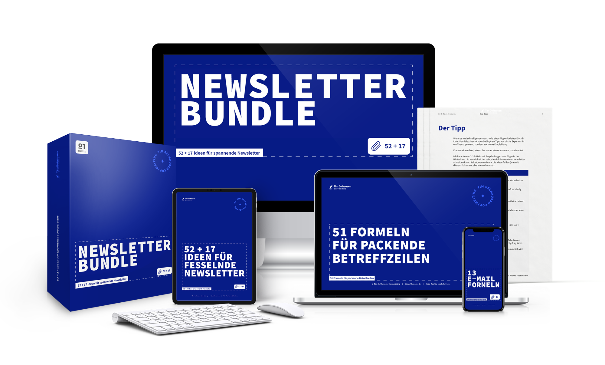 Deine Zufriedenheit ist uns wichtig! Teste das Fesselnde-Newsletter-Bundle 30 Tage lang aus. Egal, aus welchem Grund: Wenn du nicht zufrieden bist, erhältst du jeden einzelnen Cent von uns zurückerstattet. Es reicht dafür eine E-Mail an support@timgelhausen.de