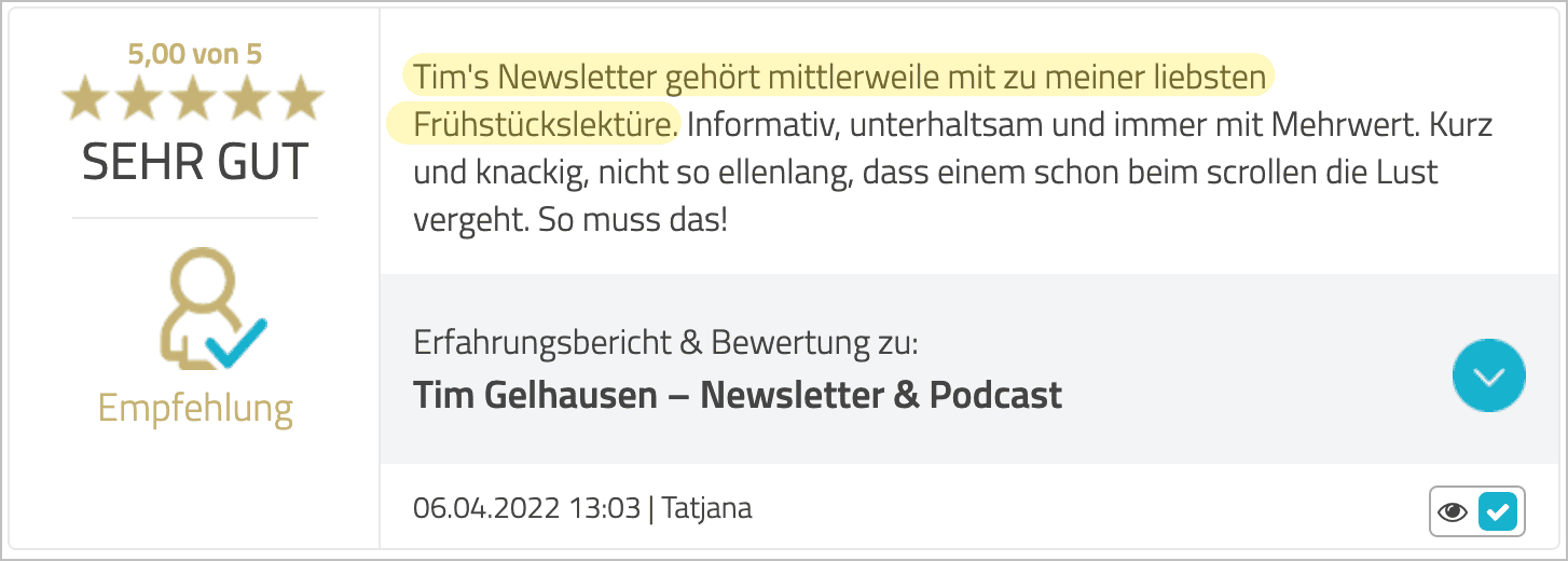 „Tim's Newsletter gehört mittlerweile zu meiner liebsten Frühstückslektüre."